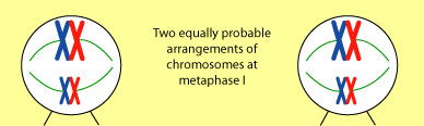 In species that reproduce sexually the chromosomes in each generation are shuffled and mixed in a variety of possible combinations. During meiosis each of the two homologous chromosomes are separated and sorted into gametes independent of the others. Each individual received a set of chromosomes from each parent of that individual. A gamete produced by that individual could conceivably contain only the chromosomes from one parent, but is far more likely to receive a random mixture of chromosomes from each parent. Since humans have 23 chromosome pairs, there are 223 possible combinations of chromosomes in each gamete —around 8 million possible combinations! Since an offspring receives a set of chromosomes from each parent, each set having 223 possible combinations of chromosomes from the grandparents, it is obvious that there is an enormous number of combinations of chromosomes in each generation, assuring a wide range of phenotypes.