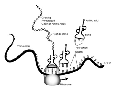 Translation of mRNA to proteins takes place in a cell structure known as a ribosome>>. These structures allow specialized molecules known as transfer RNA (tRNA) to transfer amino acids from the cell’s cytoplasm to the ribosome. The ribosome attaches the amino acid brought to it by the tRNA to the growing polypeptide chain, according to the codes on the mRNA strand. The cell keeps its cytoplasm stocked with all 20 amino acids, either by absorbing them from nutrients outside the cell or by synthesizing them from other compounds.