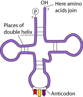 The molecules of tRNA are specialized. Each attaches to a single amino acid. The other end of the tRNA contains an anticodon, a nucleotide sequence complementary to the sequence on the RNA. This attaches to the RNA at the appropriate site according to the base pairing rules and is carried into the ribosome where the amino acid on the other end is attached to the lengthening polypeptide chain. The tRNA then detaches from the RNA as it slides out of the ribosome. Next it is carried away into the cytoplasm where it attaches to another amino acid molecule. So the tRNA is continually recycled and thus acts as a catalyst to the reaction.