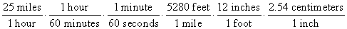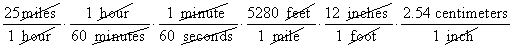 Multiplying the fractions together will converts 25 miles per hour to 1,117.6 centimeters per second.