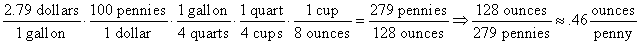 If gasoline costs $2.79 per gallon, about how many ounces can you buy for a penny?